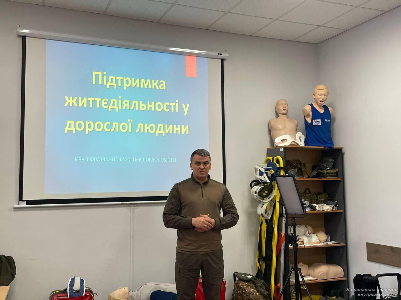 Заняття проводили завідувачка кафедри, кандидат медичних наук, доцент Ольга Несен, завідувач відділення старший лейтенант поліції Анатолій Басараб й інструктор відділення Володимир Кодій. У межах дисципліни «Основи цивільної безпеки, домедичної та психологічної допомоги» студенти разом з інструктором Володимиром Кодієм аналізували ознаки критичних станів. Увагу було зосереджено на алгоритмах дій у разі раптової зупинки кровообігу та припинення дихання. Окремим блоком розглянули особливості надання допомоги для різних вікових категорій. Оскільки техніка базової підтримки життєдіяльності (BLS) для немовлят, дітей та дорослих має суттєві відмінності, здобувачі відпрацьовували кожен алгоритм на відповідних манекенах-тренажерах.