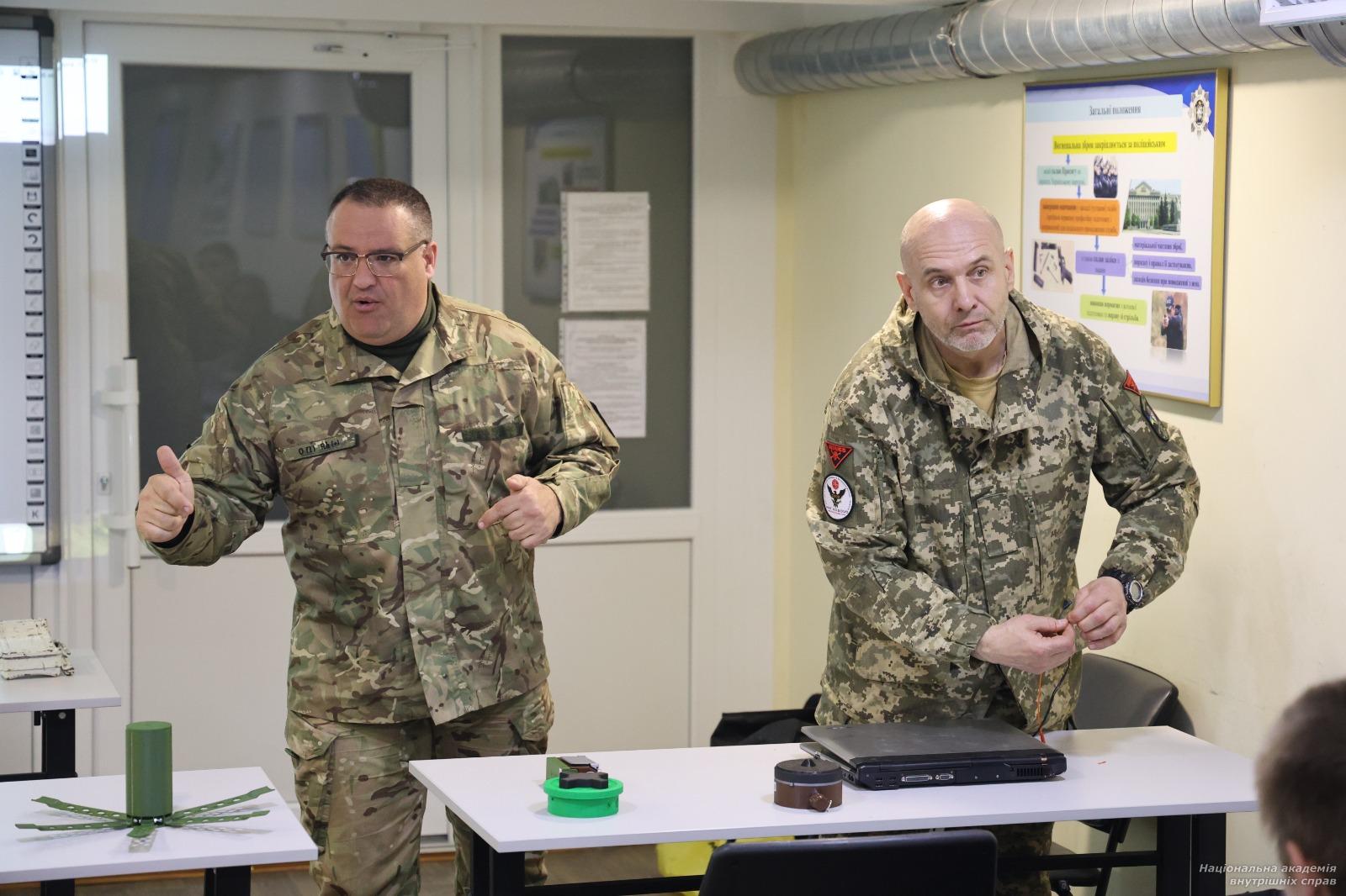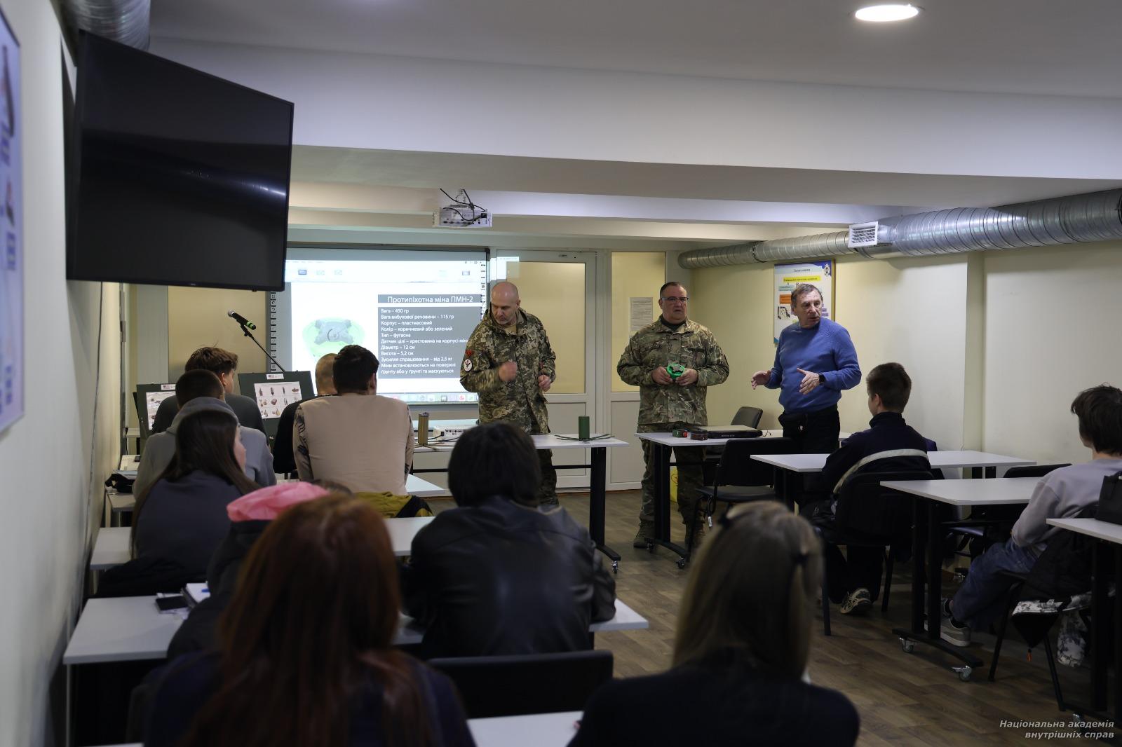 Під час проведення бінарного заняття здобувачі вищої освіти опановували навчальний матеріал з мінної безпеки. Інструктори ознайомили майбутніх фахівців з небезпечними вибуховими пристроями як саморобного, так і промислового виробництва, надали поради, як виявляти небезпечні прилади, відпрацювали алгоритми дій під час виявлення небезпечних вибухових пристроїв.