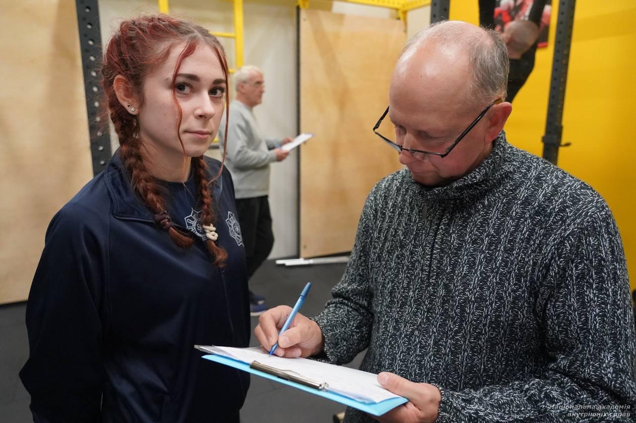 ✔ I місце – Анастасія Голінко, курсант 4 курсу, капрал поліції (ННІПД); ✔ II місце – Анастасія Шкурак, курсант 1 курсу, рядовий поліції (ННЕКІ); ✔ III місце – Анастасія Гейко, курсант 3 курсу, капрал поліції (ННЕКІ).Серед чоловіків (вправа – підтягування на перекладині):