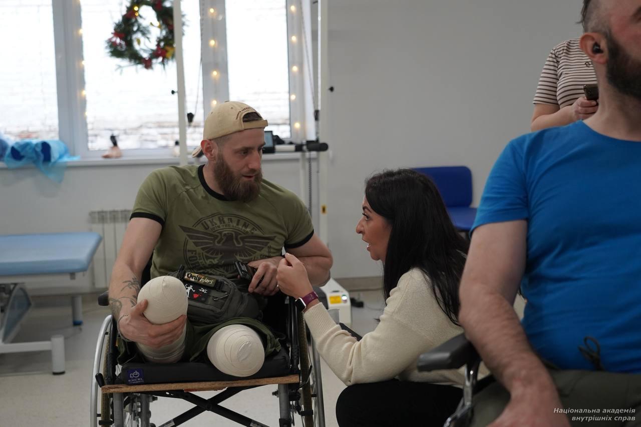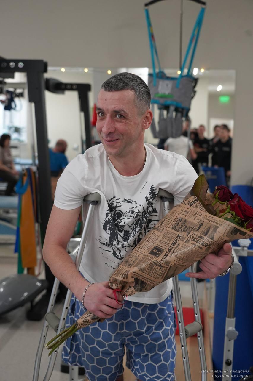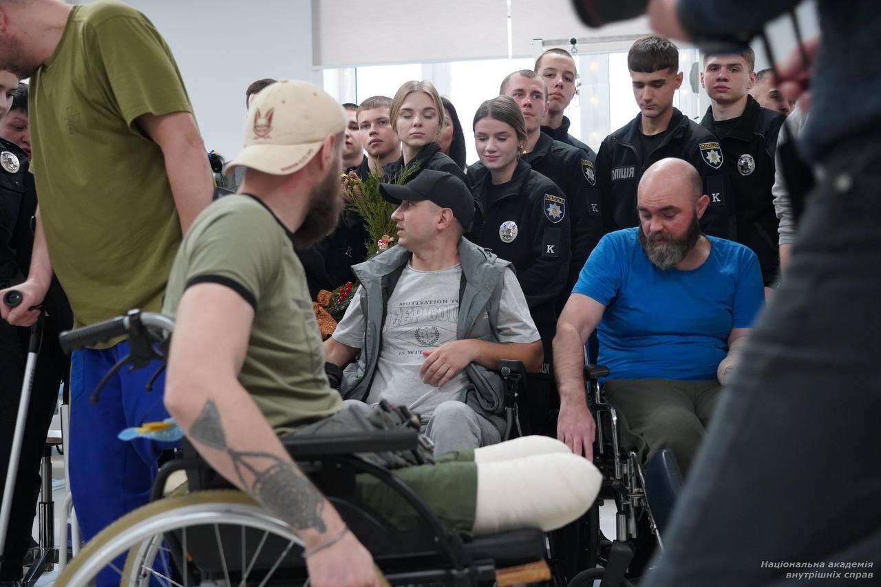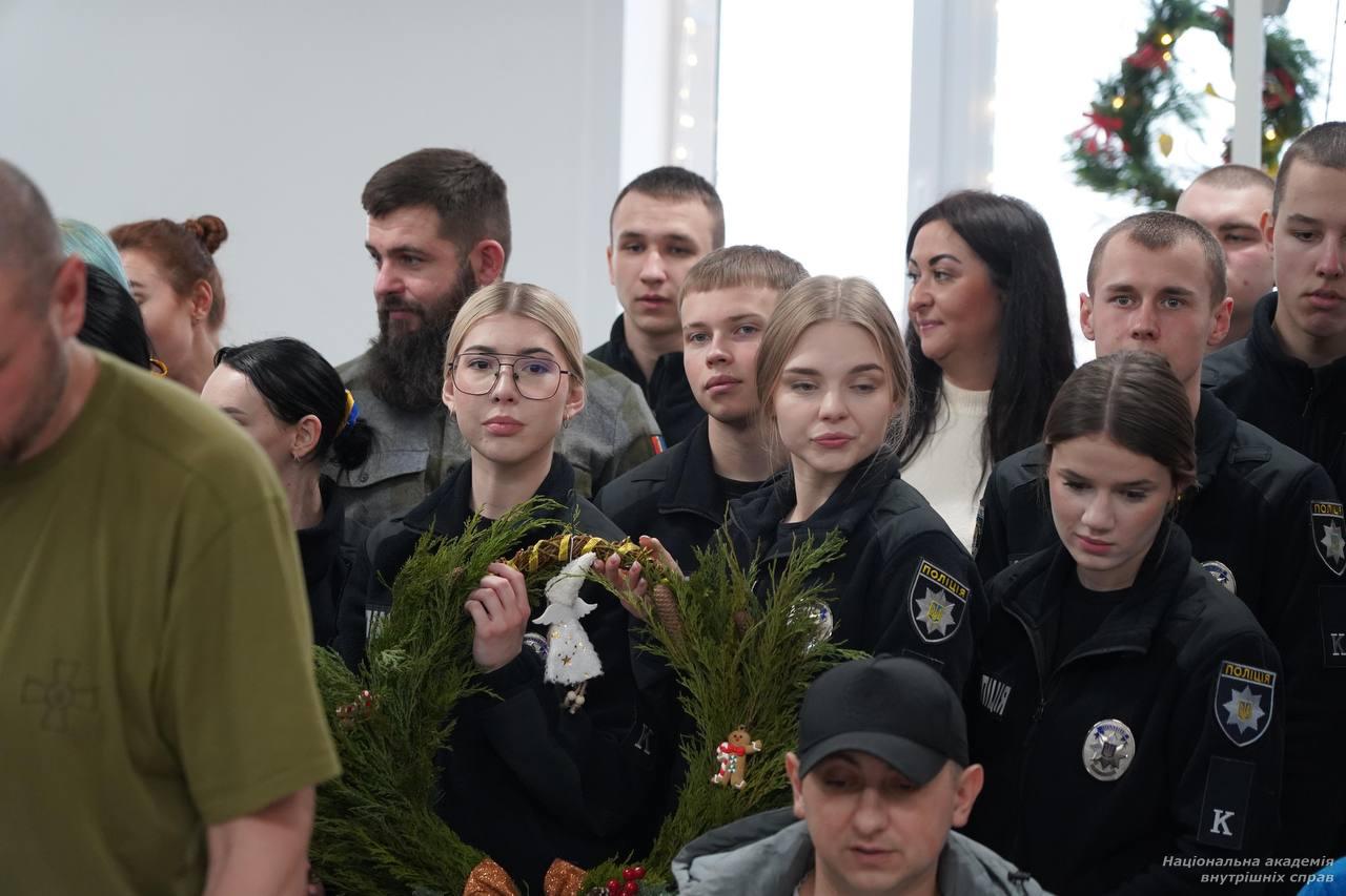 До прикрашання зали курсанти запросили й військовослужбовців, які нині перебувають у центрі на реабілітації. Серед них — Володимир Бончук (позивний – Буня), майор поліції, боєць Стрілецького полку ГУНП у місті Києві. До повномасштабної війни він служив у Департаменті поліції охорони, а раніше — у підрозділі «Азов». У березні цього року Володимир був важко поранений в обидві руки на Торецькому напрямку. Уже переніс десять операцій. Проте лікарі обіцяють, що зможуть відновити рухливість рук майже на 70 % уже до літа. Він щиро зізнався, що такі зустрічі з курсантами мають неабияке значення для поранених: «Треба хлопцям підтримувати святковий настрій. Треба жити далі. І нам приємно, коли до нас приїжджають у гості, коли на душі знову святково».