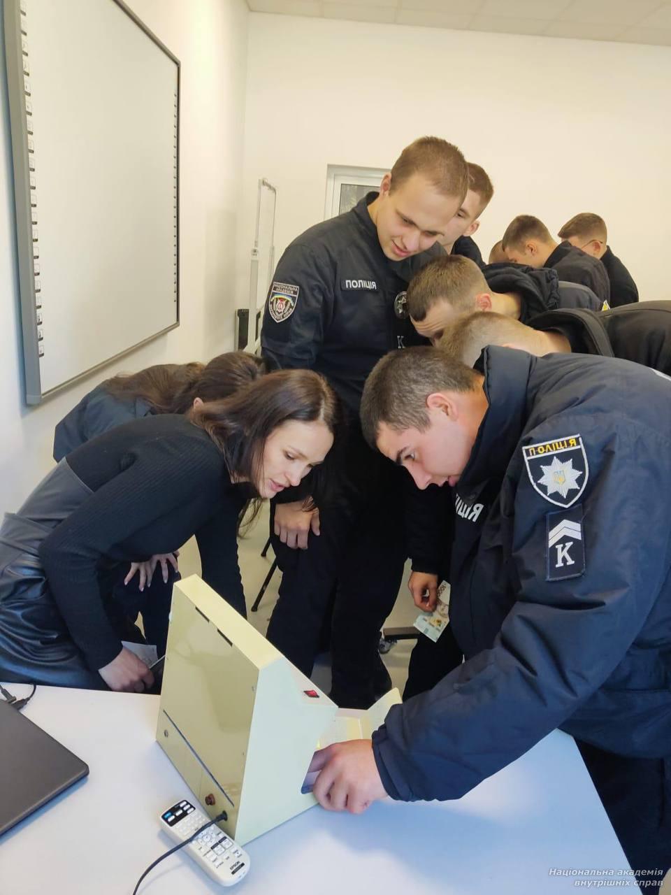 Курсанти мали змогу працювати зі зразками документів з ознаками підробки, а також практично застосувати засоби криміналістичної техніки, зокрема ультрафіолетове освітлення.