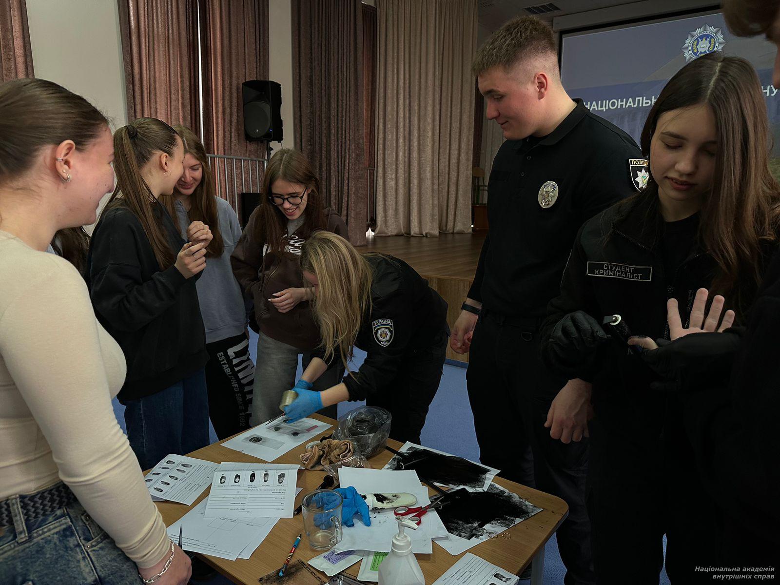 У межах профорієнтаційної роботи курсанти й студенти ННЕКІ НАВС за сприяння курсантського (студентського) самоврядування відвідали ліцей № 128 Дніпровського району м. Києва. Під час зустрічі вони зосередили увагу на сучасному векторі розвитку академії, інноваційній матеріально-технічній базі та можливостях для самореалізації. Старшокласники дізналися про специфіку роботи судових експертів і криміналістів, спробували самостійно створити дактилоскопічну карту.