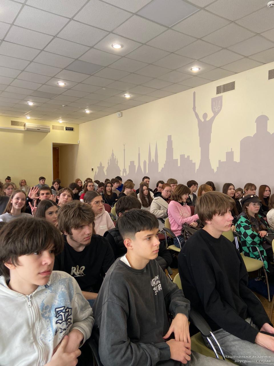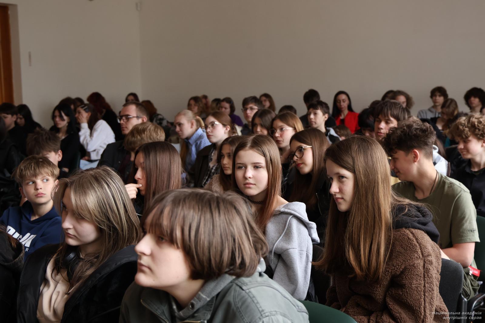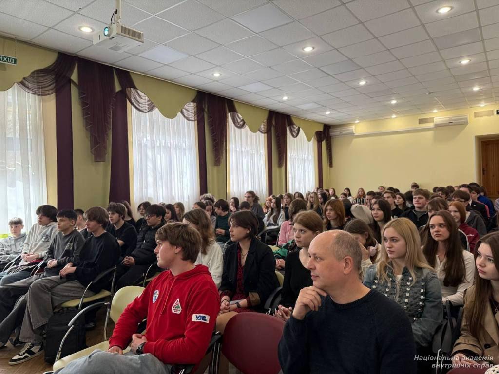 У межах профорієнтаційної ініціативи захід для учнів ліцею № 144 провели завідувач кафедри кримінології та інформаційних технологій Владислав Школьніков, доцент кафедри кримінального права Анна Павловська, доцент кафедри поліцейської діяльності Неля Лях і провідний фахівець відділу організації освітнього процесу Яна Івченко.