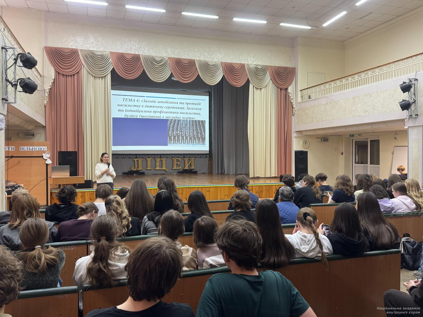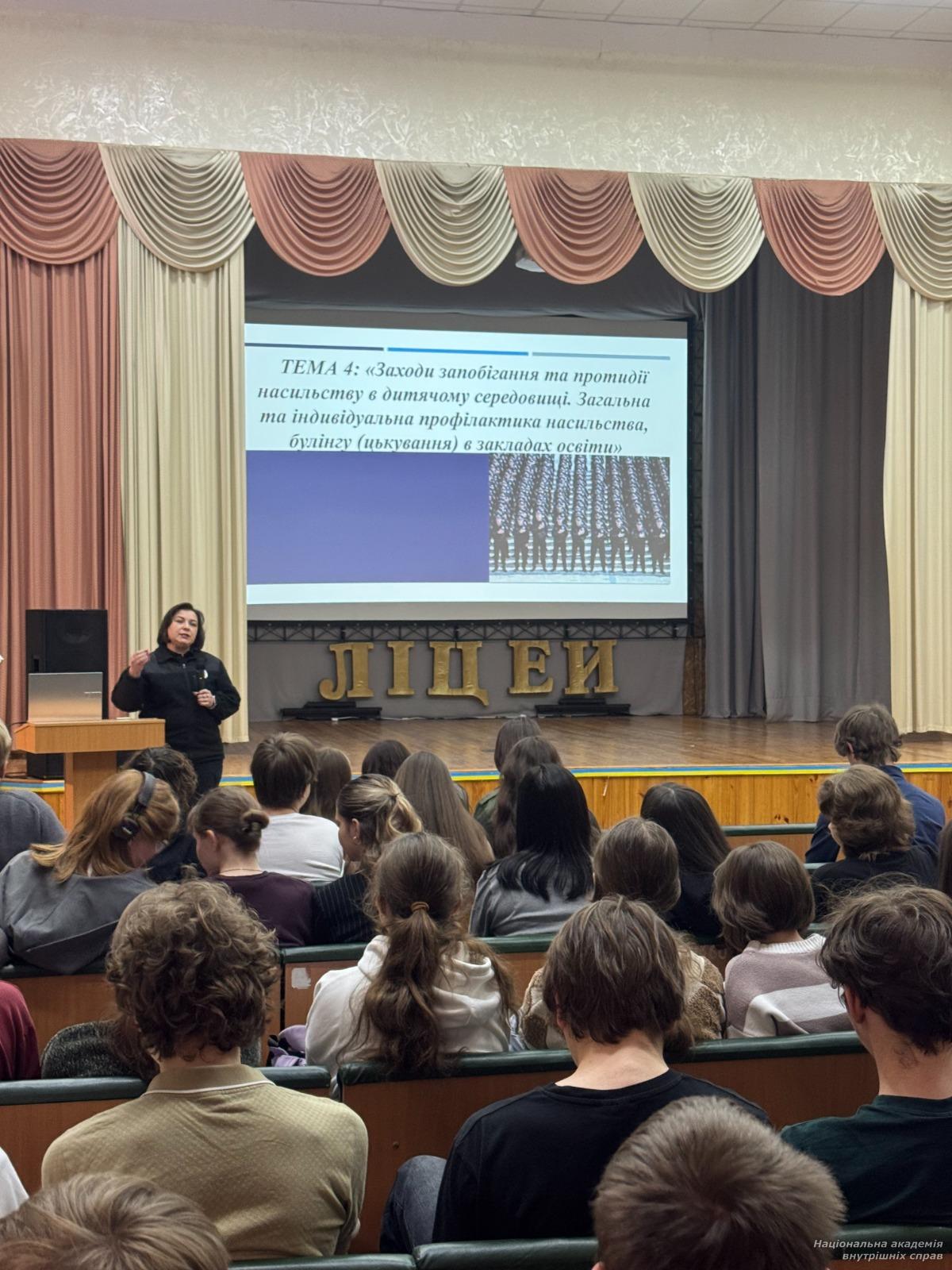 Ліцеїсти мали змогу дізнатися більше про сучасні підходи до підготовки фахівців, які поєднують юридичні знання, цифрові компетентності та практичні навички роботи в умовах сучасних викликів. Представники академії провели лекцію, присвячену питанням кібергігієни: увагу було спрямовано на правила захисту особистої інформації, безпечного користування соціальними мережами та відповідальному ставленні до цифрового контенту. Учням надали практичні рекомендації щодо розпізнавання онлайн-загроз, захисту персональних даних і безпечної поведінки в мережі Інтернет. Окремий блок лекції присвятили адміністративній і кримінальній відповідальності неповнолітніх, розглянули правові наслідки правопорушень, примусові виховні заходи та види відповідальності за законодавством України.