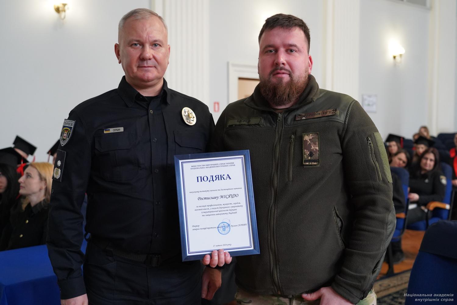Під час урочистостей було відзначено випускників, які, поєднуючи навчання зі службою, виявили мужність, професіоналізм і відданість Україні. Ректор вручив подяки військовослужбовцям, поліцейським, медикам і представникам сил безпеки й оборони України.