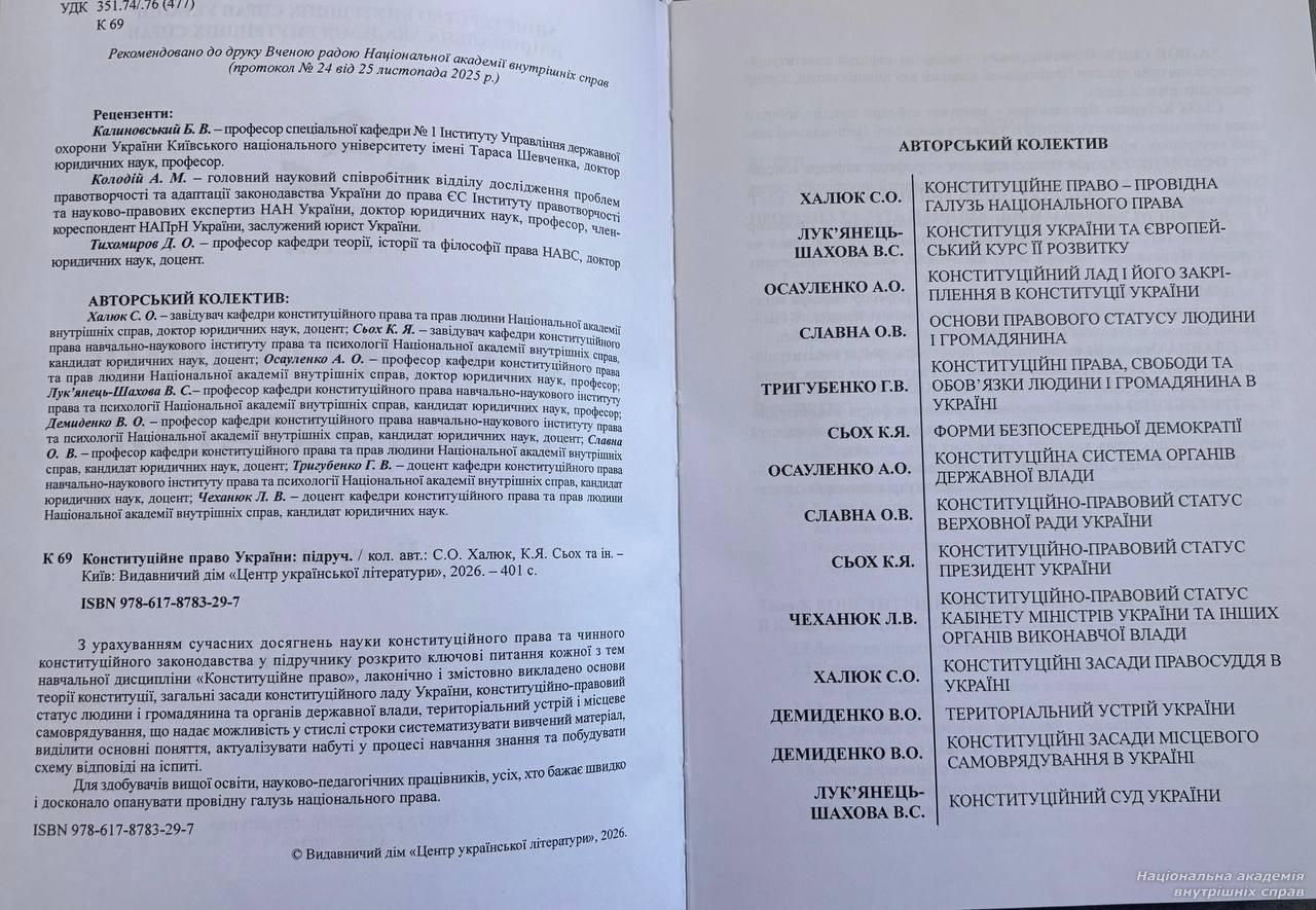 11-03-2026 Переглядів: 64Авторський колектив Національної академії внутрішніх справ підготував і видав підручник «Конституційне право України», який усебічно відображає ключові питання кожної з тем навчальної дисципліни.