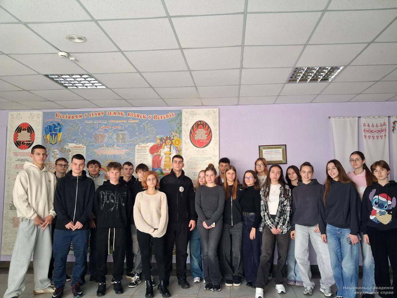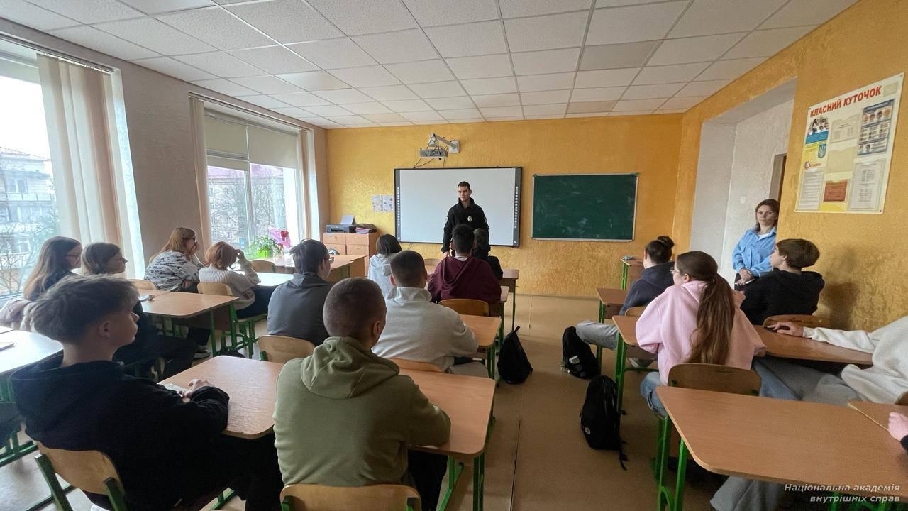 Під час зустрічі курсант поділився власним досвідом навчання в академії, розповів про дисципліни, практичну підготовку, особливості курсантського життя, діяльність студентського самоврядування та можливості для саморозвитку. Учні активно ставили запитання щодо умов вступу, вимог до фізичної підготовки, проходження відбору й можливостей подальшого працевлаштування.