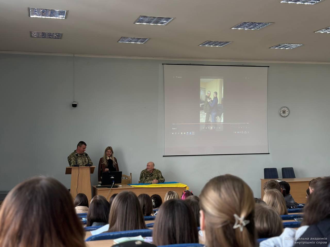 27-03-2026 Переглядів: 64До здобувачів вищої освіти навчально-наукового інституту права та психології НАВС завітали захисники Маріуполя — підполковник Петро Тесленко, Герой України, і сержант Олег Самарський. Військовослужбовці, які пережили російський полон, що тривав понад два роки, поділилися особистими свідченнями про пережиті випробування, що набувають особливого значення в контексті осмислення сучасних викликів у сфері прав людини й державності.